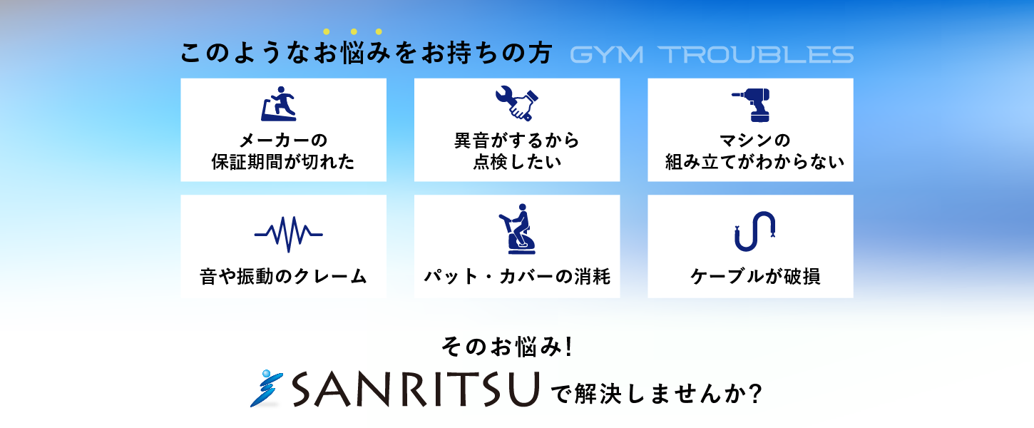 SANRITSUは、トレーニング機器の販売やメンテナンスから、集客につながるイベントのご提案まで施設運営に関わる幅広いニーズにお応えします。さらに、騒音・振動対策商品など、快適で安全な施設づくりを支える用品も取り扱っております。 私たちの豊富なノウハウを活かし、お客様の運営する施設の成功に向けた最適なソリューションをご提供いたします。