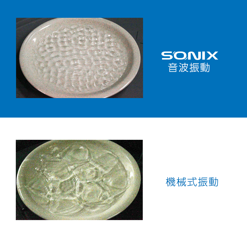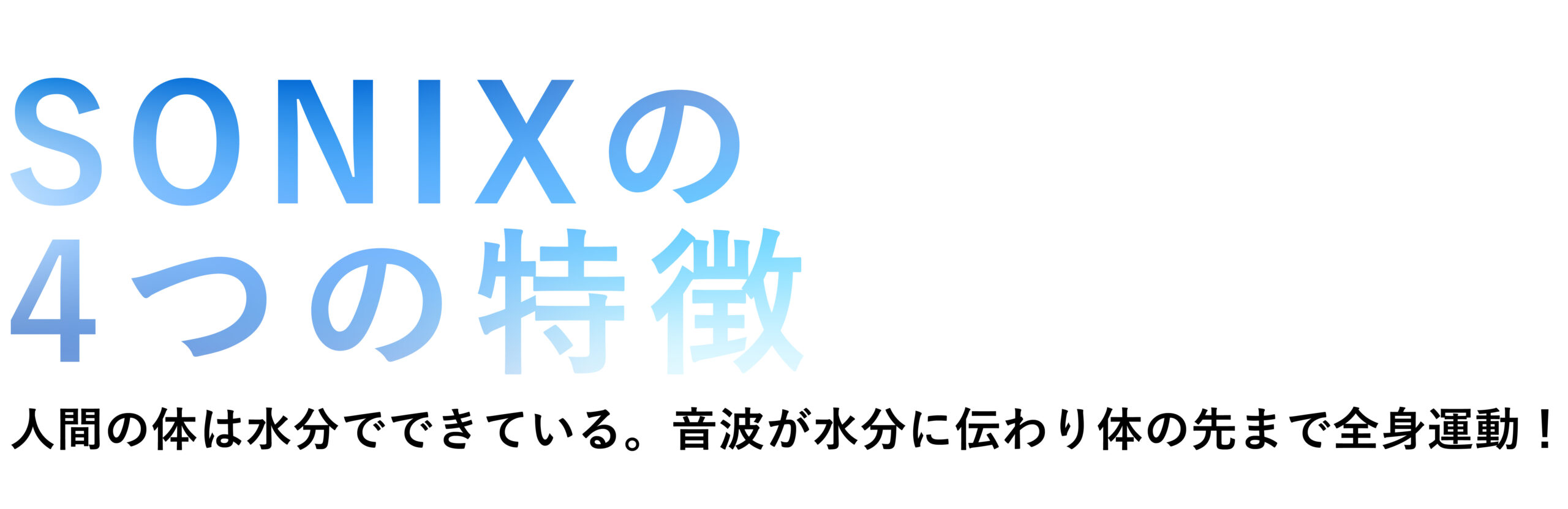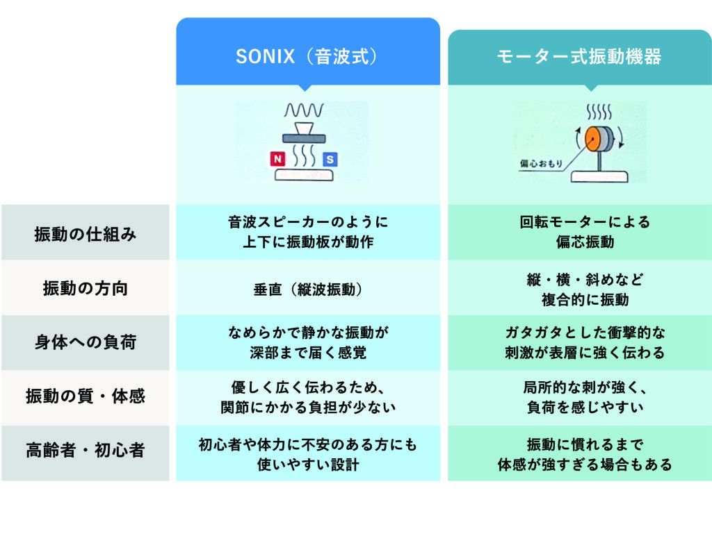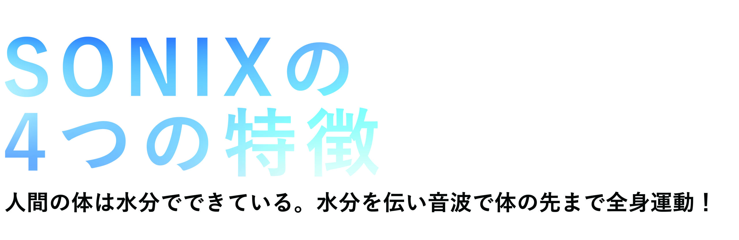 水中では音を鳴らすと非常に響きやすく、よく伝わります。この機器は、その音の響きの周波数と強度(強さ)をコントロールできる機器です。人体は大部分が水分で構成されているため、身体の中の骨にまで振動を伝え、刺激を伝達することができます。これにより、リンパと血流の流れが促進され、身体のむくみが軽減し、老廃物が排出されることで体内が活性化し、代謝が向上します。SONIXの振動は、一般的な振動マシンとは異なります。他社の振動マシンはモーターによる機械式振動であるのに対し、SONIXはスピーカーの原理を利用した音波振動によるものです。例えるならば、フワっとした振動感覚です。
