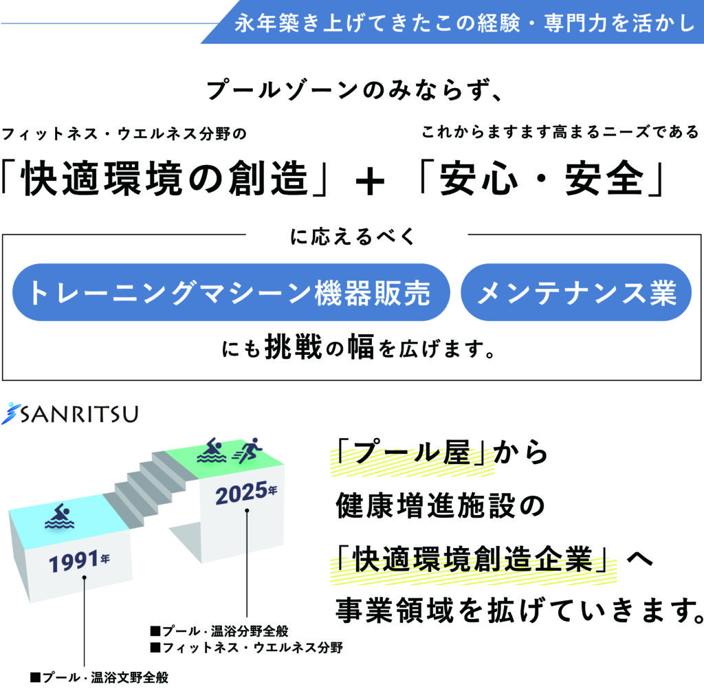三立は設立から35年、プール業界の専門商社として、プール備品販売のみならず総合スポーツクラブの新店時の企画設計・プール本体工事・サウナ工事などプール施設に関わる事すべてに携わってきました。その間、様々な経験を積み、ノウハウを積み上げてきました。と同時に様々な業種の協力会社様とも切磋琢磨を繰り返し信頼関係も強固にしてきました。